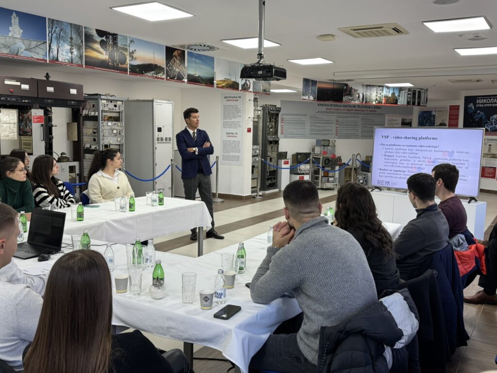 U prelepom okruženju Muzeja emisione tehnike i pogledom na Beograd sa vrha tornja, studenti su se upoznali sa pitanjima regulacije, ulogom i nadležnostima Regulatornog tela za elektronske medije, kao i sa trenutnom situacijom na medijskom tržištu u Srbiji.